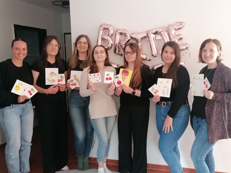 Anlässlich des JGA von Braut Julia, durfte ich am vergangenen Samstag, den 23.08.2025, mit 6 weiteren Teinehmerinnen Julias JGA in Bergkamen begleiten. Der Aquarell-Workshop war ein perfekter Rahmen für den JGA, um Freundschaften zu stärken und gemeinsam zu entspannen - denn dies hatte sich die Braut ausdrücklich gewünscht. Wir brachten als Gemeinschaftsprodukt Kirschen zu Papier, bevor sich dann jede individuell auf ihre eigenen Motivwünsche konzentrieren konnte. Obwohl alle Teilnehmerinnen anfangs meinten, dass sie keine geborenen Künstlerinnen seien, wre den Produkten anzusehen, mit wie viel Eifer, Kreativität und Freude an das Malen herangegangen sind. Es sind fantastische Ergebnisse entstanden.